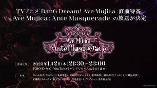 2025年1月2日(木) 21:30よりTOKYO MXにてTVアニメ放送直前特番「Ave Mujica:Ante Masquerade」が放送決定。出演は佐々木李子さん(ドロリス/三角初華役)・渡瀬結月さん(モーティス/若葉睦役)・岡田夢以さん(ティモリス/八幡海鈴役)・米澤茜さん(アモーリス/祐天寺にゃむ役)・高尾奏音さん(オブリビオニス/豊川祥子役)を予定している。