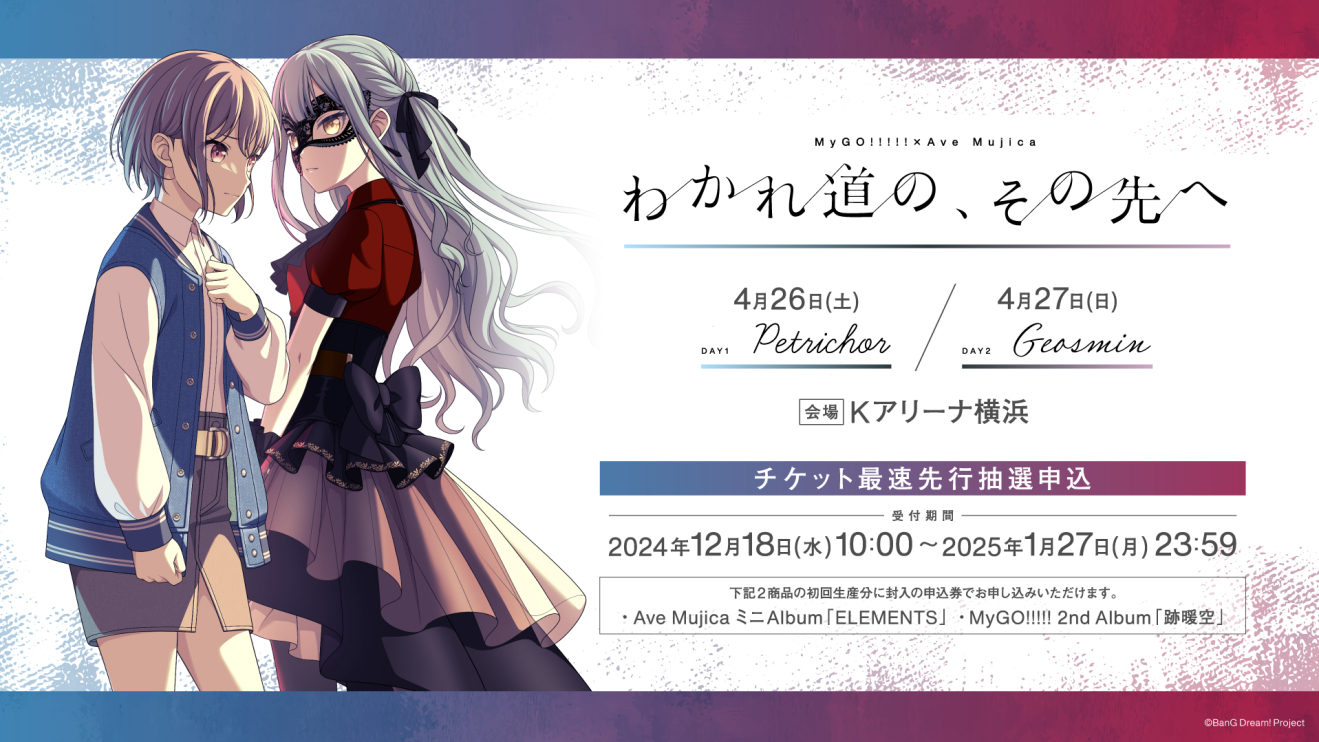 2025年4月26日(土)・27日(日)にKアリーナ横浜にて開催されるMyGO!!!!!×Ave Mujica合同ライブのタイトルが「わかれ道の、その先へ」に決定。Ave Mujicaミニアルバム「ELEMENTS」およびMyGO!!!!! 2ndアルバム「跡暖空」にチケット最速先行抽選申込券が封入されている。