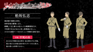 無表情で寡黙な青年。世界各地の戦場に立ち、蹂躙してきた偉人の杜きっての戦闘要員だが、不死身であるがゆえに死へ恐怖感が乏しい。ひたむきな性格で「〜であります」という特徴的な語尾で話す。