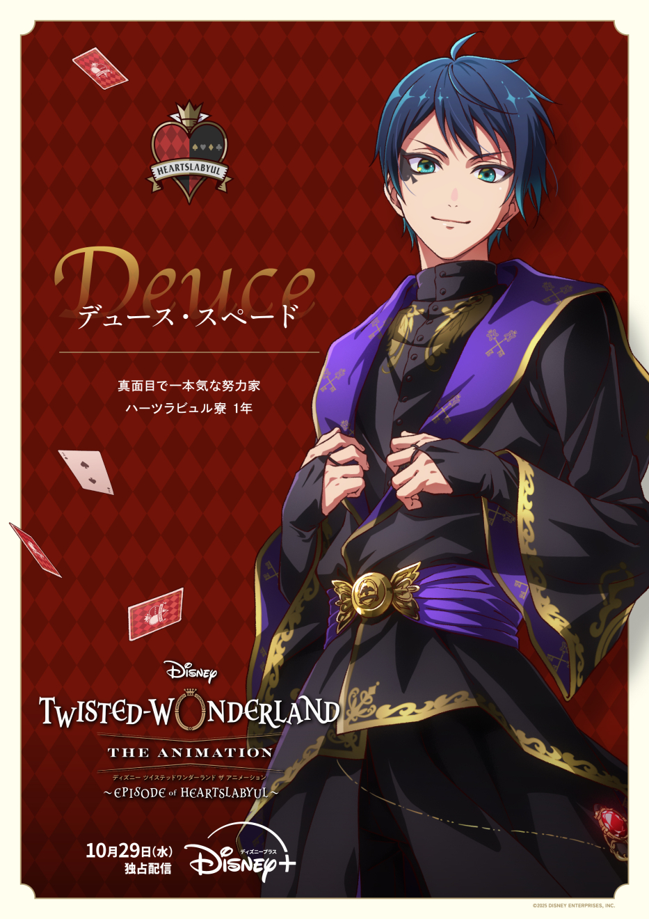 2025年10月29日(水)よりDisney+で独占配信されるアニメ『ディズニー ツイステッドワンダーランド ザ アニメーション』。本作よりシーズン1「エピソード オブ ハーツラビュル」で物語の中心となる8名のキャラクターポスターが公開された。