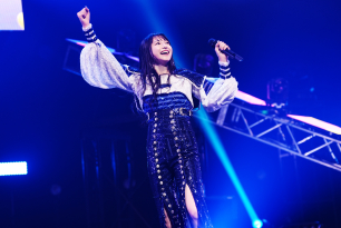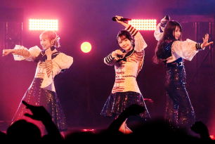 ”の異名を持つ彼女たち。「本気の筋肉でいくけど大丈夫そう?」(雨宮)とファンに煽ると、エネルギッシュかつアッパーな「WANTED GIRL」、可憐でキュートな一面を見せた「whiz」と人気のシングル曲を立て続け、日替わり曲「Believe」ではキリッとした表情とボーカルを観客に届ける。続く「Ah! La Vie En Rose!!! -ア!ラ・ビ・アン・ローズ-」はベリーダンスのような振り付けや「ウッ!ハッ!」というかけ声と正拳突き、突然始まる寸劇からの「ヤバイ!水のみた〜い!」というキメのフレーズなどユニークな見どころが満載。最後はステージがスモークに包まれて、3人は夢のように消え去った。