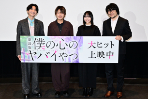 2026年2月13日(金)に全国ロードショーを迎えた劇場版『僕の心のヤバイやつ』。本作の公開記念舞台挨拶が本日2026年2月14日(土)に新宿バルト9で行われ、堀江瞬さん(市川京太郎役)・羊宮妃那さん(山田杏奈役)・島ア信長さん(南条ハルヤ役)・赤城博昭総監督が登壇した。