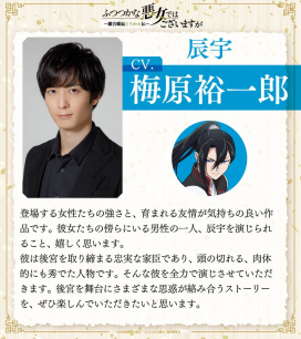 登場する女性たちの強さと、育まれる友情が気持ちの良い作品です。彼女たちの傍らにいる男性の一人、辰宇を演じられること、嬉しく思います。彼は後宮を取り締まる忠実な家臣であり、頭の切れる、肉体的にも秀でた人物です。そんな彼を全力で演じさせていただきます。後宮を舞台にさまざまな思惑が絡み合うストーリーを、ぜひ楽しんでいただきたいと思います。